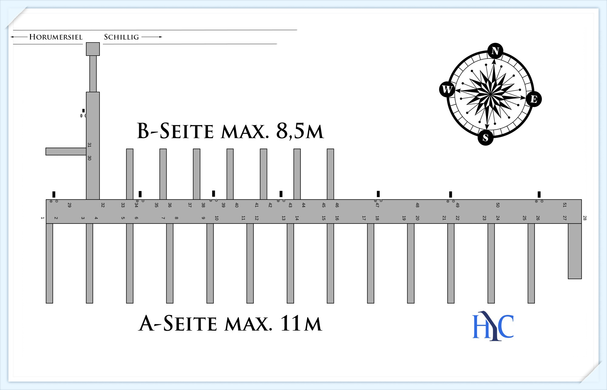 Hafenseite (A-Seite): Platz für Boote bis zu einer Länge von 11m