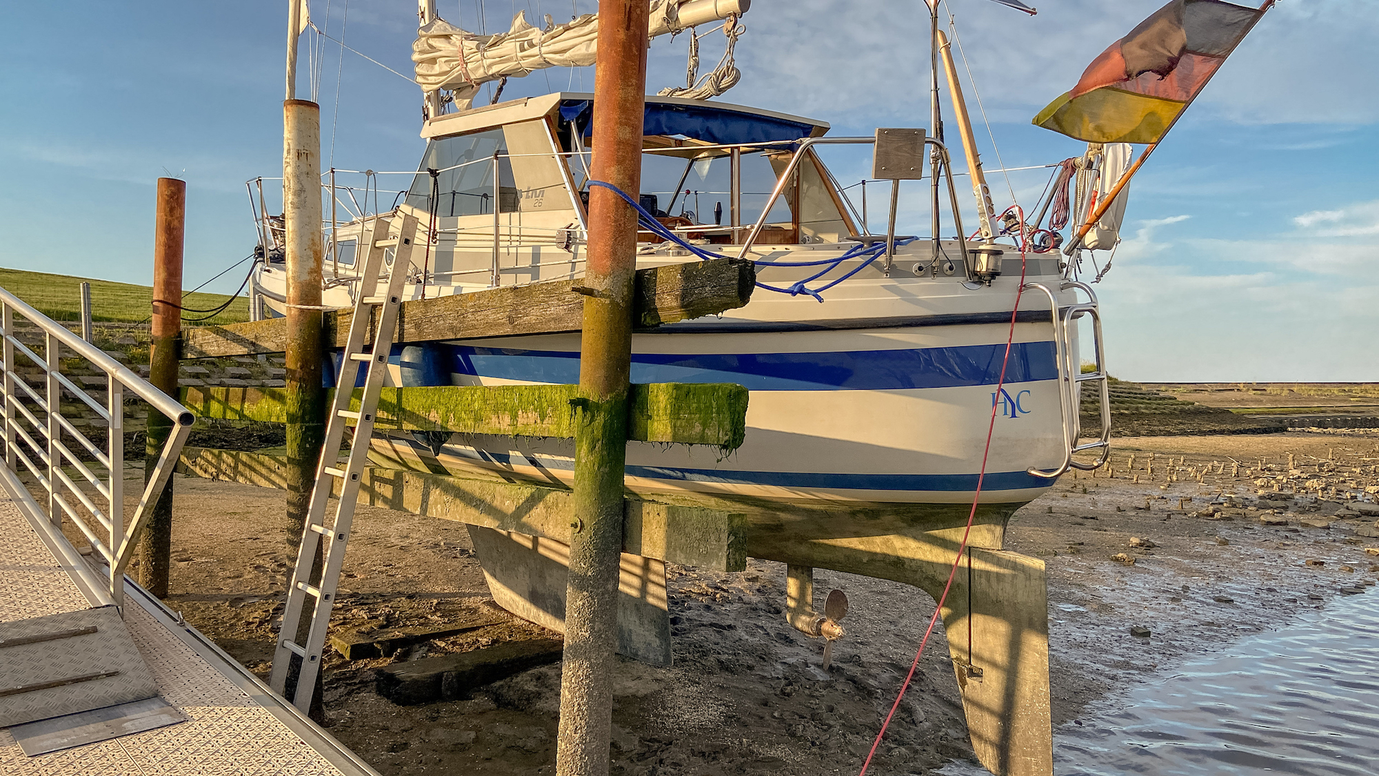Da der Untergrund leicht abschüssig ist, empfiehlt sich eine zusätzliche Leine vom Bug zum Land.